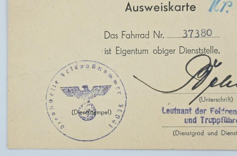In a very nice condition a German Wehrmacht Feldgendarmerie ID Card. The card reads that the bicycle that is used is owned by the Feldgendarmerie-Trupp 451 accourding the feldpostnumber.