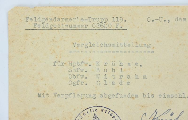 The message comes from the Feldgendarmerie-Trupp 119 and contains the message that the named soldiers have gotten food till 3 days ago.