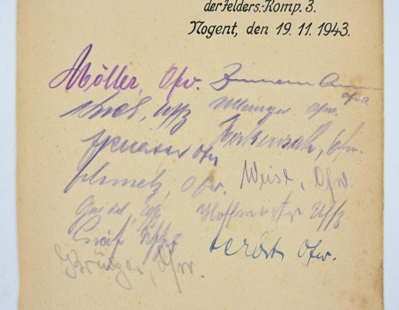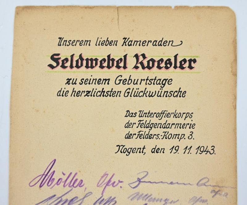 The card is for Feldwebel Roesler for his birthday signed by all non-commisioned officers of the Feldgendarmerie korps 3.