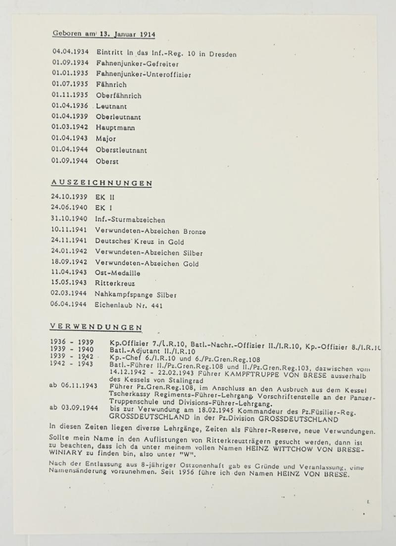 Signature of Wehrmacht KC-OLC Recipient (Heinz Wittchow von Brese-Winiary)