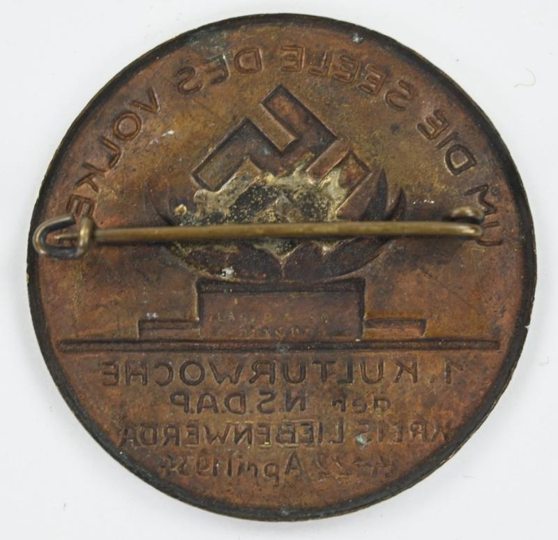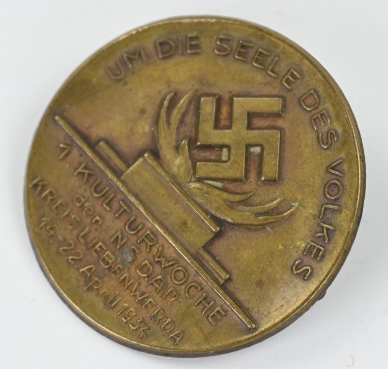 In a very good condition an rare ealry NSDAP Kreis Liebenwerda badge of 1934. 1st culture week of the NSDAP on April 14-22 1934. The badge comes with a functional needle and catch.