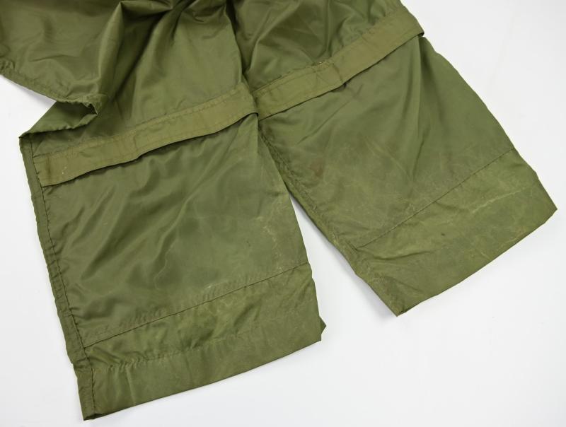 In a mint condition a stunning US Navy pilot lightweight flying suit. Unlined nylon. Size 38L. Made by ALDA MILLS. WWII contract. Two flap closing pockets on lower front legs area. 4 zipper closing pockets on side and rear legs area. One main zipper. All working, made by TALON. Waist pulling straps. Very rare and great item for a late WWII US Navy or USMC pacific theater Corsair, Avenger or hellcat pilot impression.