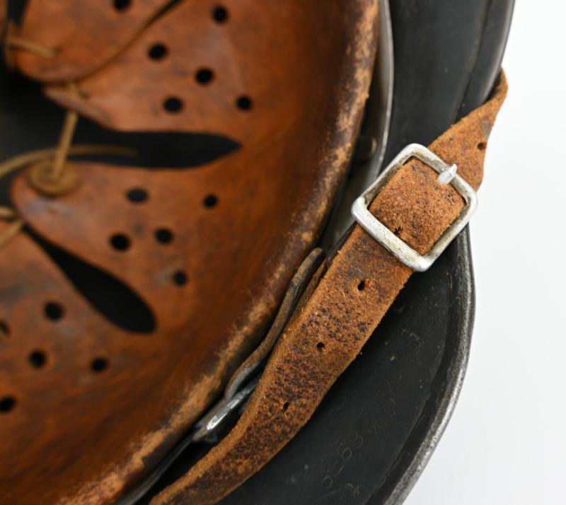 The helmet liner is never taken out of the helmet and is complete with a Luftwaffe Kommandatur marked chinstrap dated 1937.
