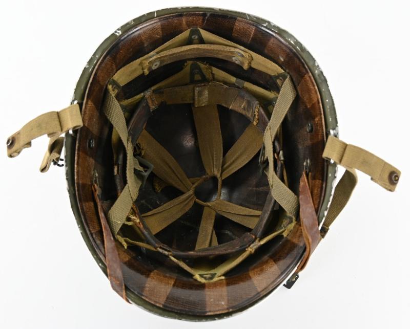 Inside the helmet shell is a stunning Westinghouse paratrooper liner present with both A-Yokes original attached and with complete used webbing.