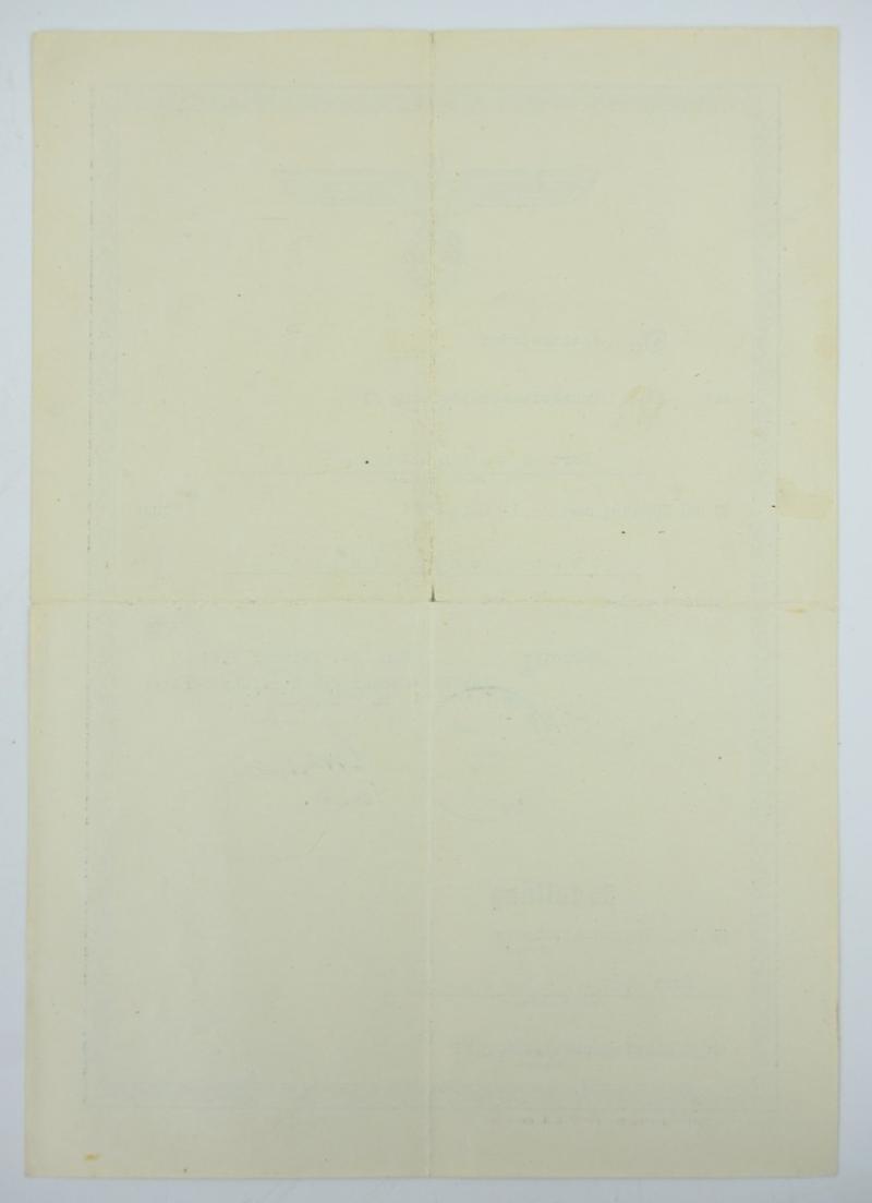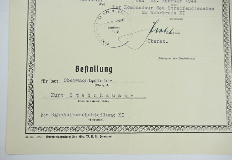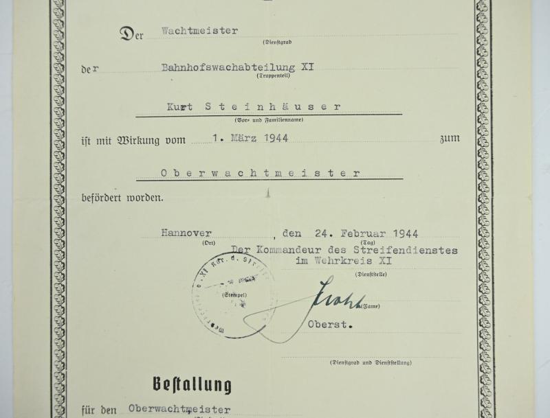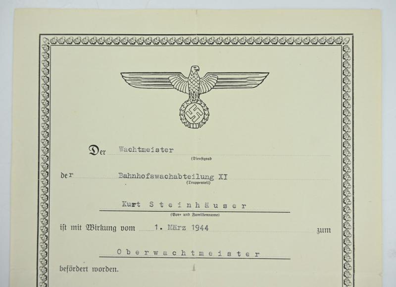 In a very nice condition a German Wehrmacht Streifendienst Rank Promotion Certificate on the name of Kurt Steinhauser promoted to Oberwachtmeister in 1944. A very nice certificate!