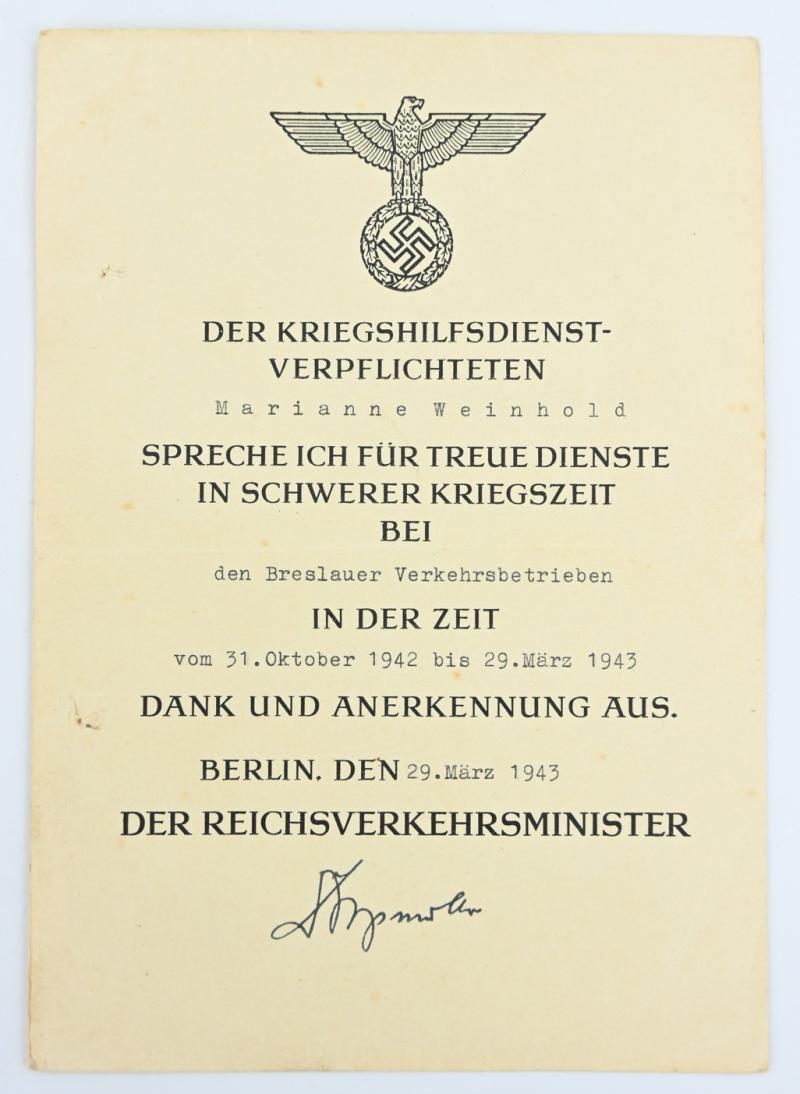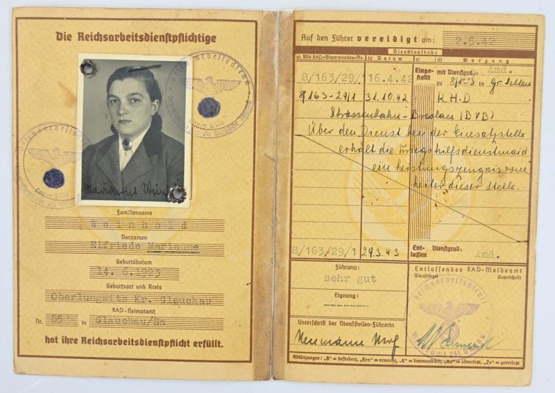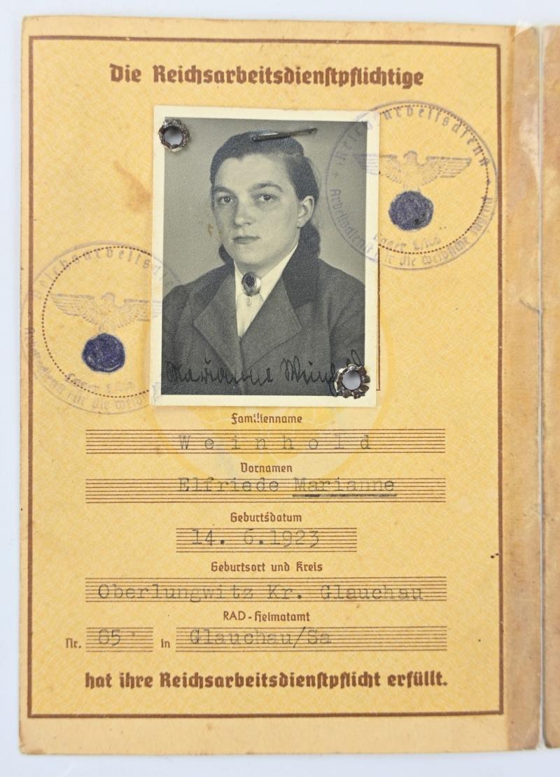 In a very nice condition a German Reichsarbeitsdienst Good Conduct Certificate and pass on the name of Marianne Weinhold.