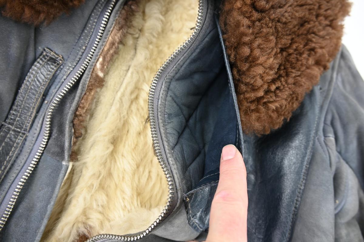 The jacket comes in a very good mannequin size and is constructed in blue-black suede shearling with a fur lining and large cotton backed fleece collar.