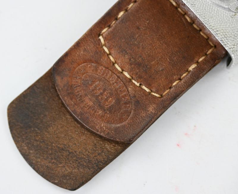 The beltbuckle comes in Aluminium and has a very nice brown leather tab and is nicely maker marked by Gustav Brehmer from Markneukirchen and dated 1939.