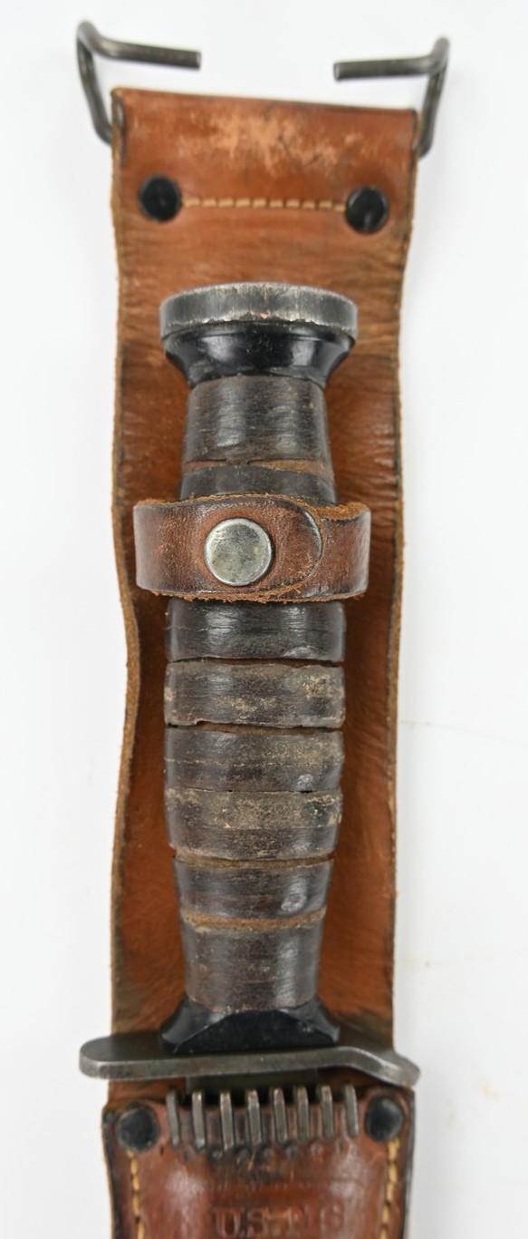 The knife is attached to a stunning leather M6 Scabbard maker marked by Viner Bros and is 1943 dated.