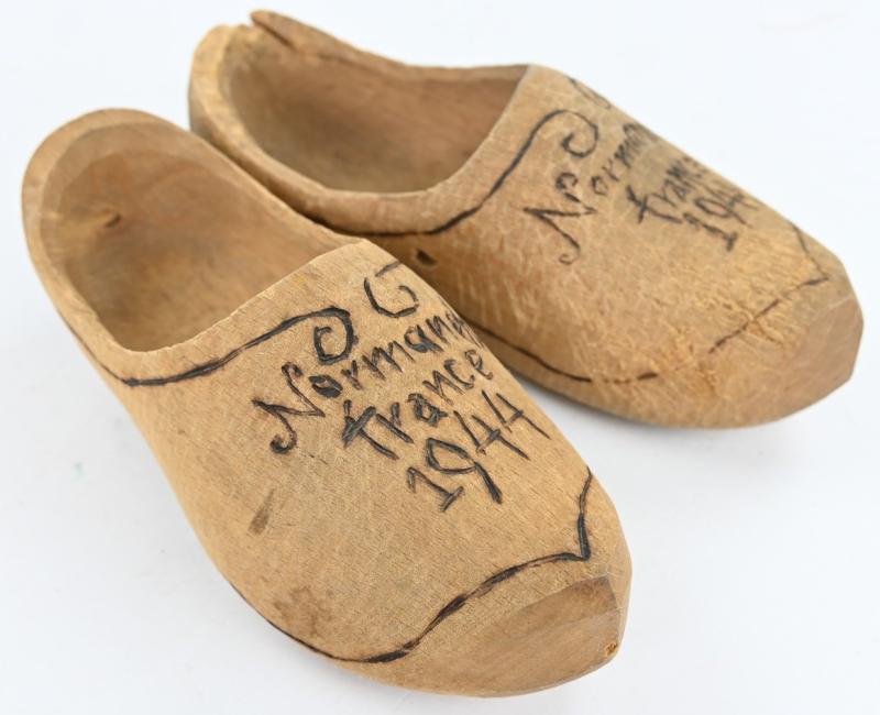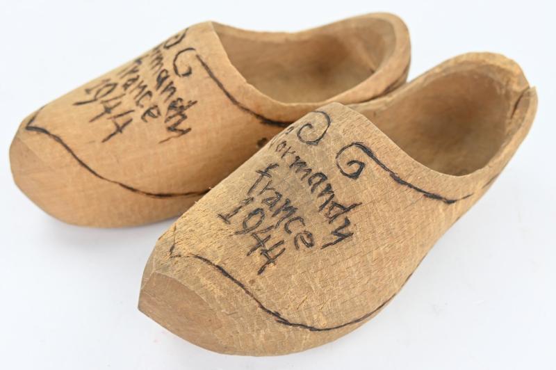 In a very nice condition a matching set of French made wooden shoes. The shoes are found in the USA and a veteran souvenir. Nicely marked on top 'Normandy France 1944'