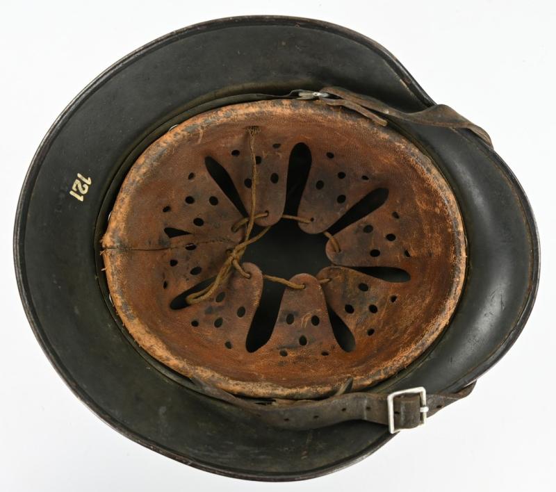 Attached to the helmet is the original Aluminium chinstrap that is dated 1940.