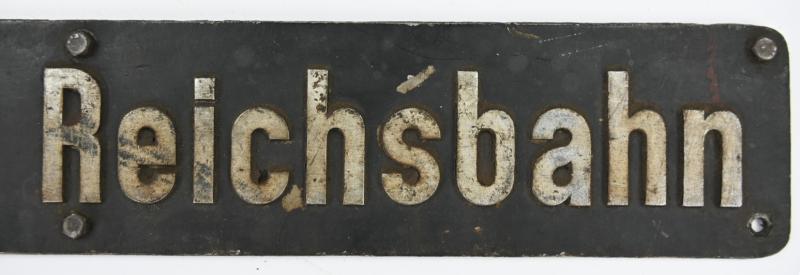 The raised “Deutsche Reichsbahn” lettering is sharply defined, and the plate features correct mounting holes, indicating genuine period use rather than postwar reproduction or decorative manufacture. Signs of age, wear, and surface patina are fully consistent with wartime service and long-term storage.