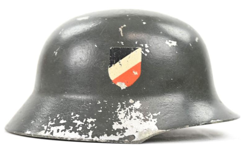 These miniature helmets were used as a replacement for the groom when he was at the front and could not be present at his own wedding, so that the bride could still get married. The bride would place her hand on the miniature helmet and take the marriage vows in his absence.