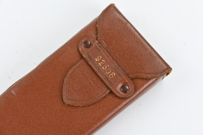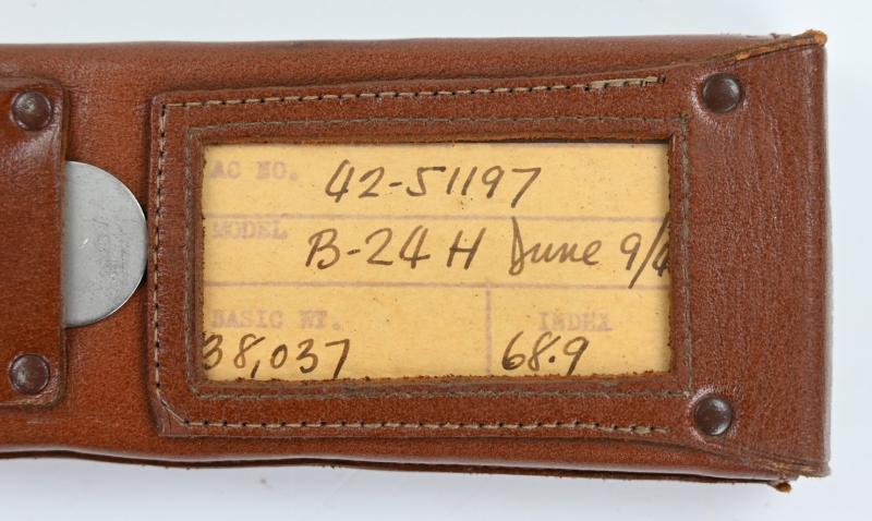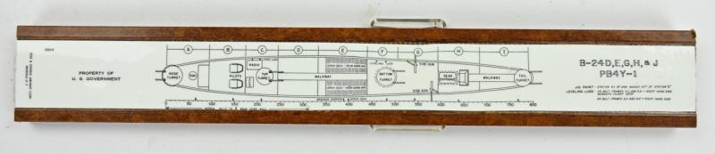 Nicely maker marked by Cox & Stevens Aircraft Corp. Load adjuster for the B-24 Liberator bombers. Looks similar to a conventional slide rule but was used to ensure the correct weight distribution throughout the airframe depending on the amount of fuel, bombload etc. A bit grubby and with minor loss of the white plastic 'coating' in places. Also lacks the sliding 'cursor'. Complete with fully marked leather case with some minor damage on the opening.