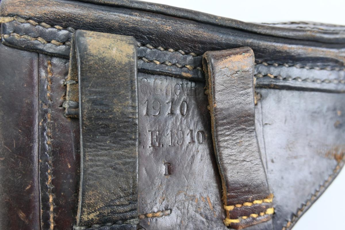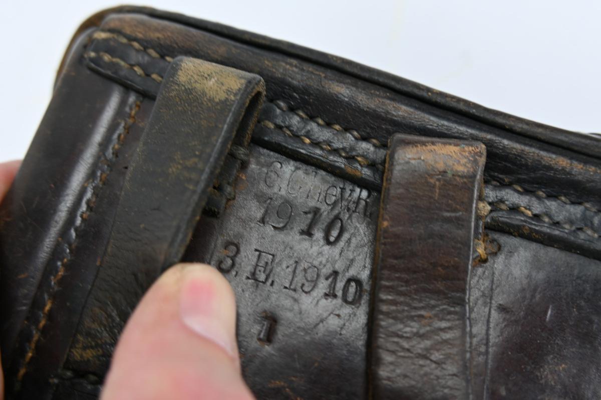 The brown leather holster comes in a complete condition and is nicely maker marked on the reverse side, unit marked (10th company /Infantry Regiment 21) and dated 1910.