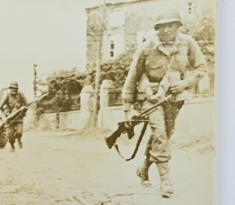 In a very good condition a stunning US WW2 Press Photo of combat actions in the town of 'La Haye du Puits' in the Normandy Peninsula.