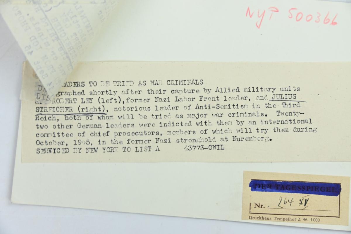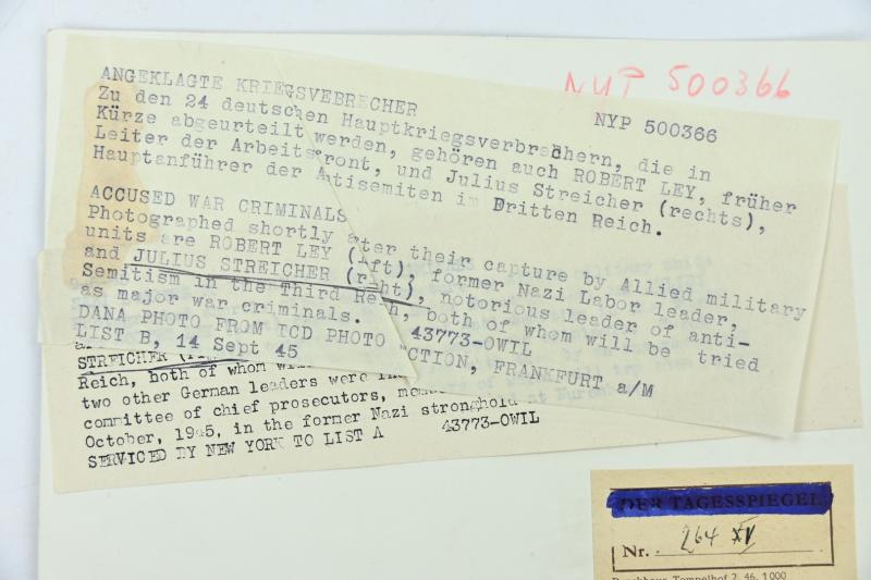 In a very nice condition an Allied Press 'Mug-Shot' Picture of Nuremberg Trail Members Robert Ley former nazi labor leader and Julius Streicher (Nazi Party leader and founder of Der Stuermer).