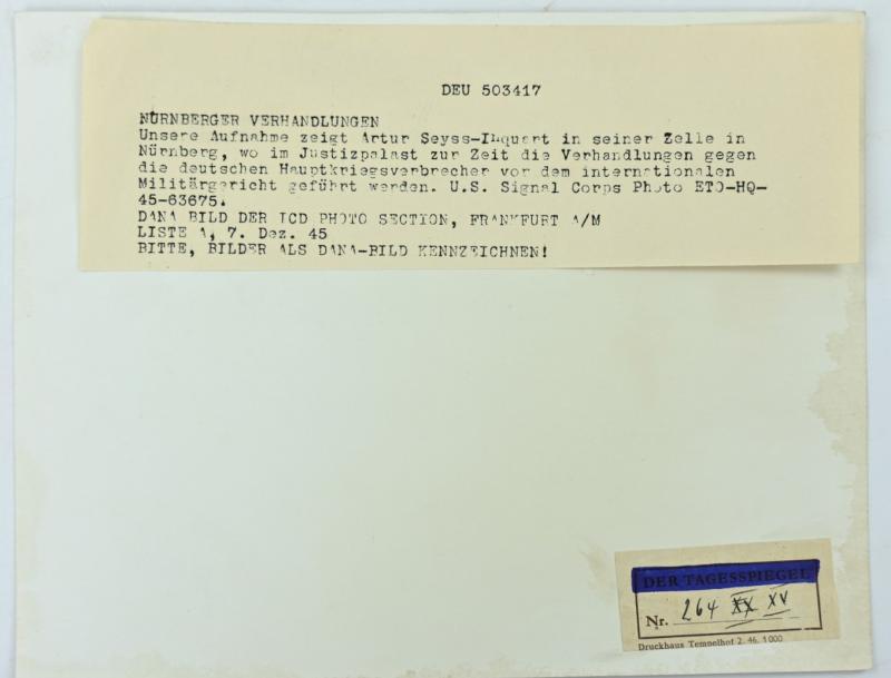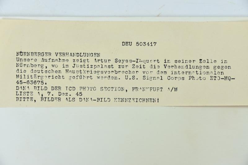 In a very nice condition an original Allied Nuremberg War Trail Press photo of Arthur Seyss-Inquart.