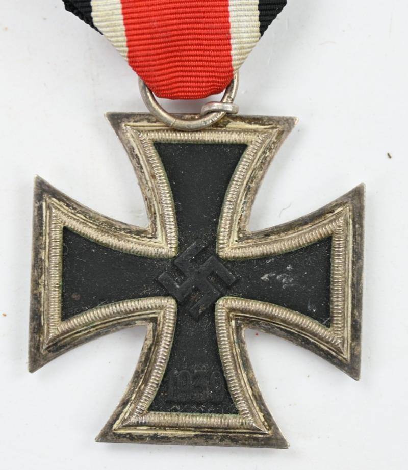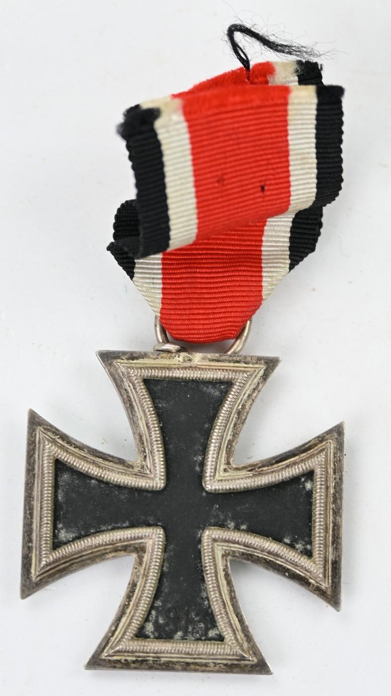 In a very good condition a German WW2 Iron Cross 2nd Class (or Eiserne Kreuz 2.Klasse) The cross comes without maker marking and the small ring is a bit bend. It's complete with the attached ribbon.