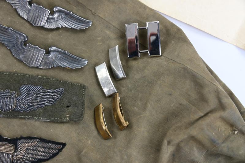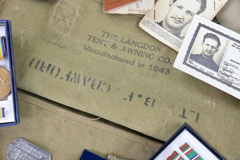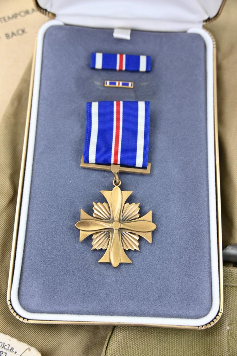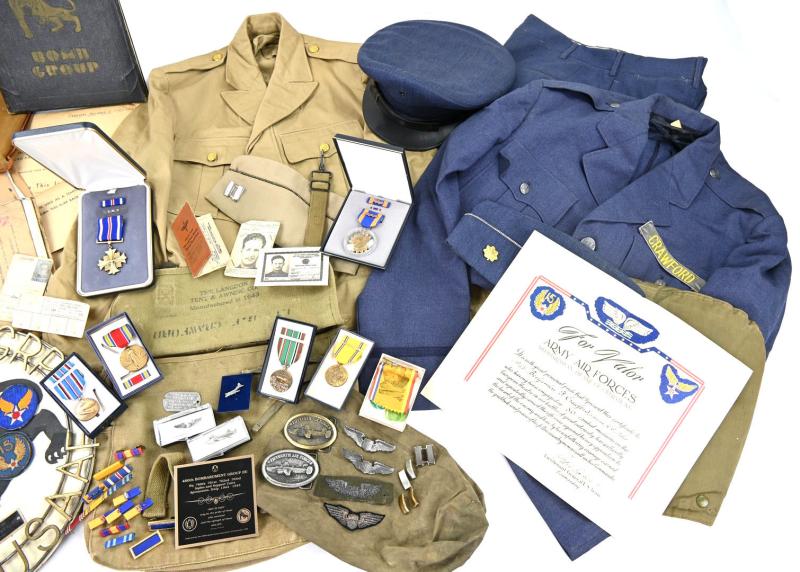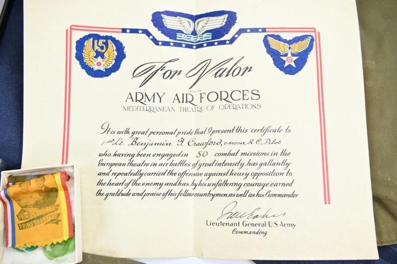 Also his wartime musset bag, dogtags, pilot wings (included bouillon wings) 50 missions certificate, medals (postwar issued) large