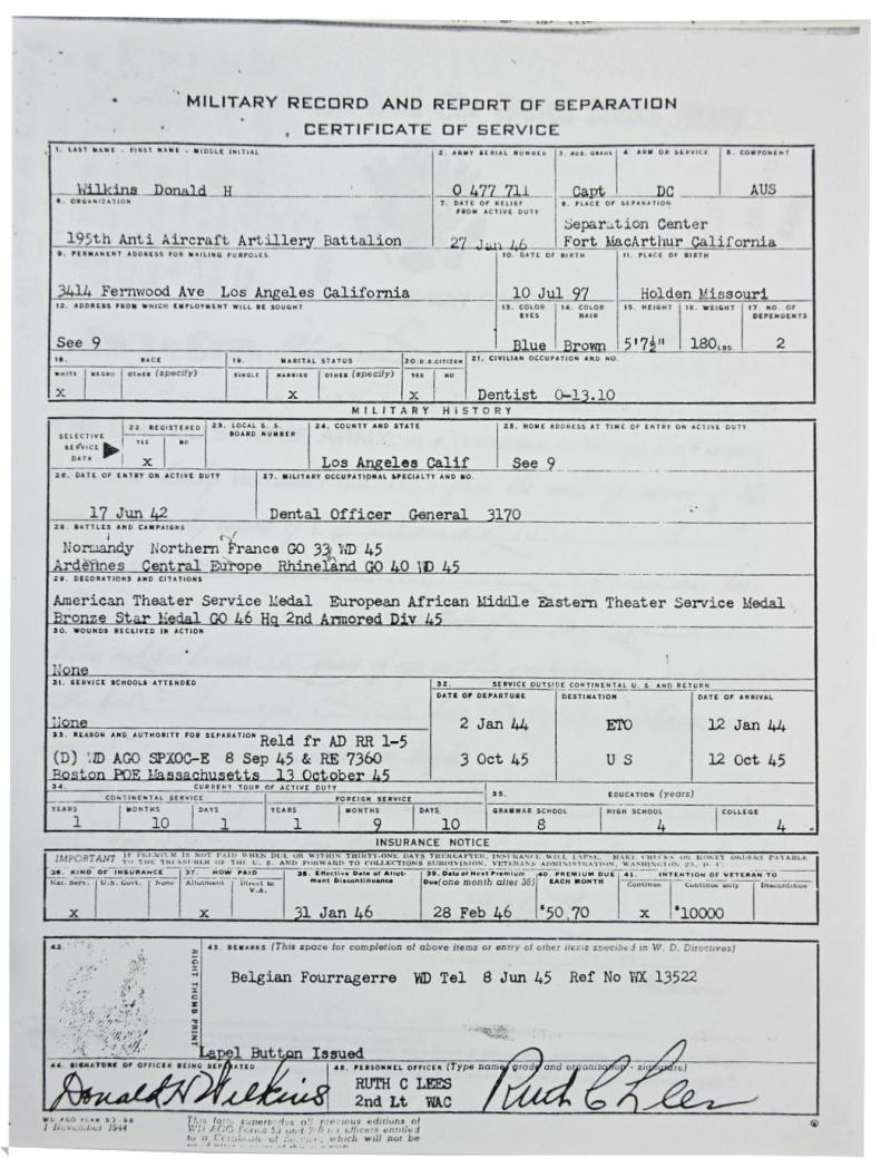 US WW2 Grouping of Captain Donald H. Wilkins, Divisional Dental Sorgeon 2nd Armored Division