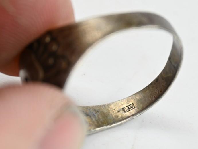 The ring is made of 835 Silver and nicely marked inside the ring. It contains a stunning skull on the frontside.