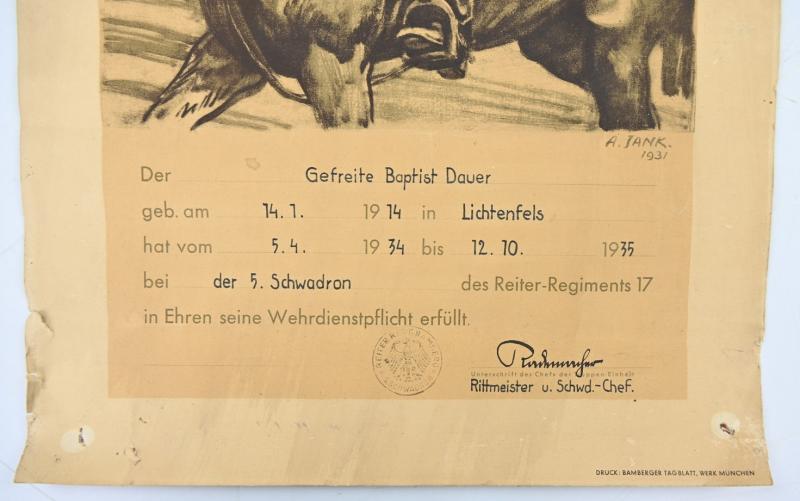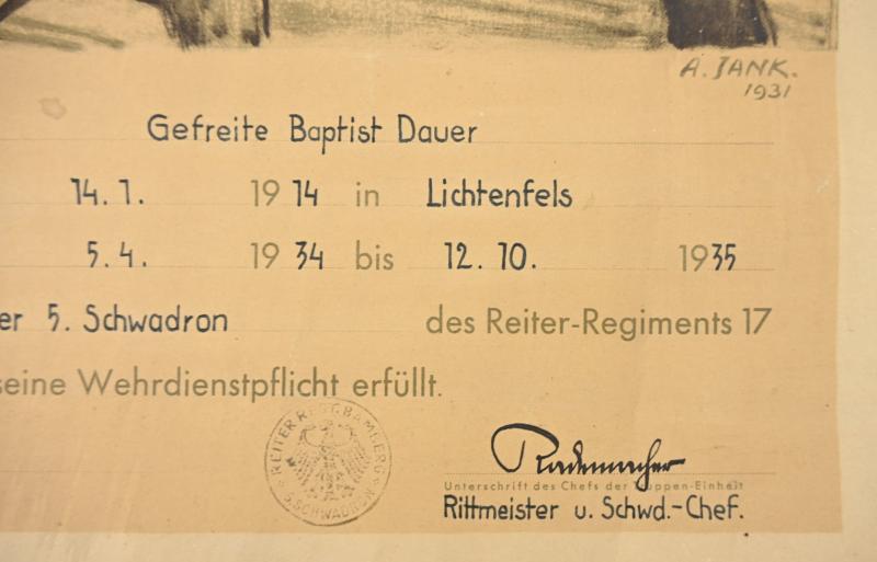 In a very nice condition a stunning German Reichswehr Cavalry Certificate of 1935. The certificate comes in a poster size of approx 40x60cm.