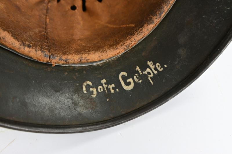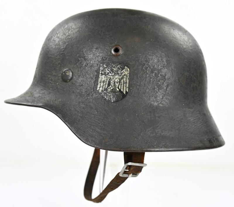 His helmet is a very stunning Wehrmacht M35 Reissued Single Decal Combat Helmet with the original (shortened) chinstrap still present attached to the original placed helmet liner.