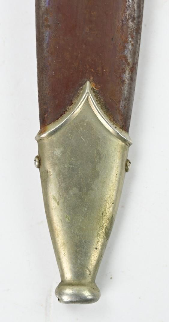 The scabbard comes in a matching condition with the rest of the dagger. The brown painted scabbard body shows only light scratches one light dent, and has managed to retain almost all of the original paint and comes with traces of aging.