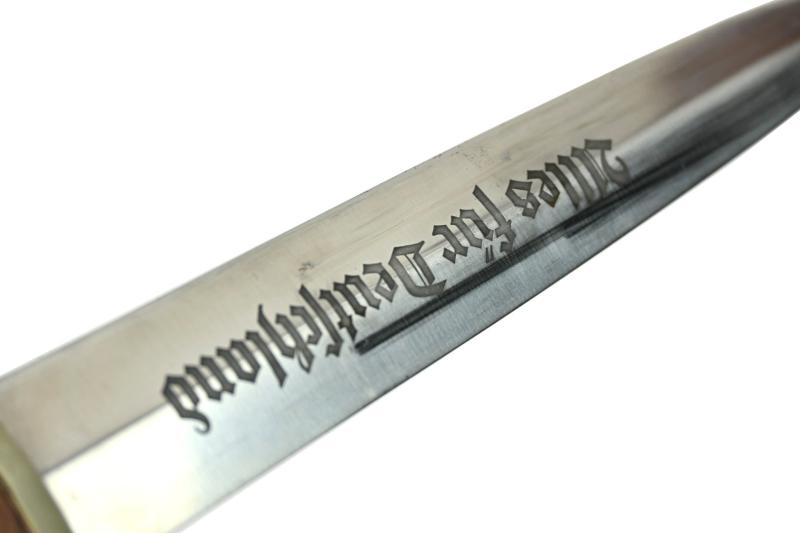 The blade has on the front the motto in a black tone and surface of the blade is virtually flawless, save the typically scabbard runner marks that we see on all SA daggers.