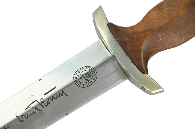 Following the 1934 "Night of the Long Knives" purge, Hitler ordered the Ernst Röhm signature removed from SA and SS honor daggers. Known as "Ground Röhm daggers," these pieces typically have the inscription removed via factory grinding or field-expedient filing, making "ground" or partially ground examples highly collectible.