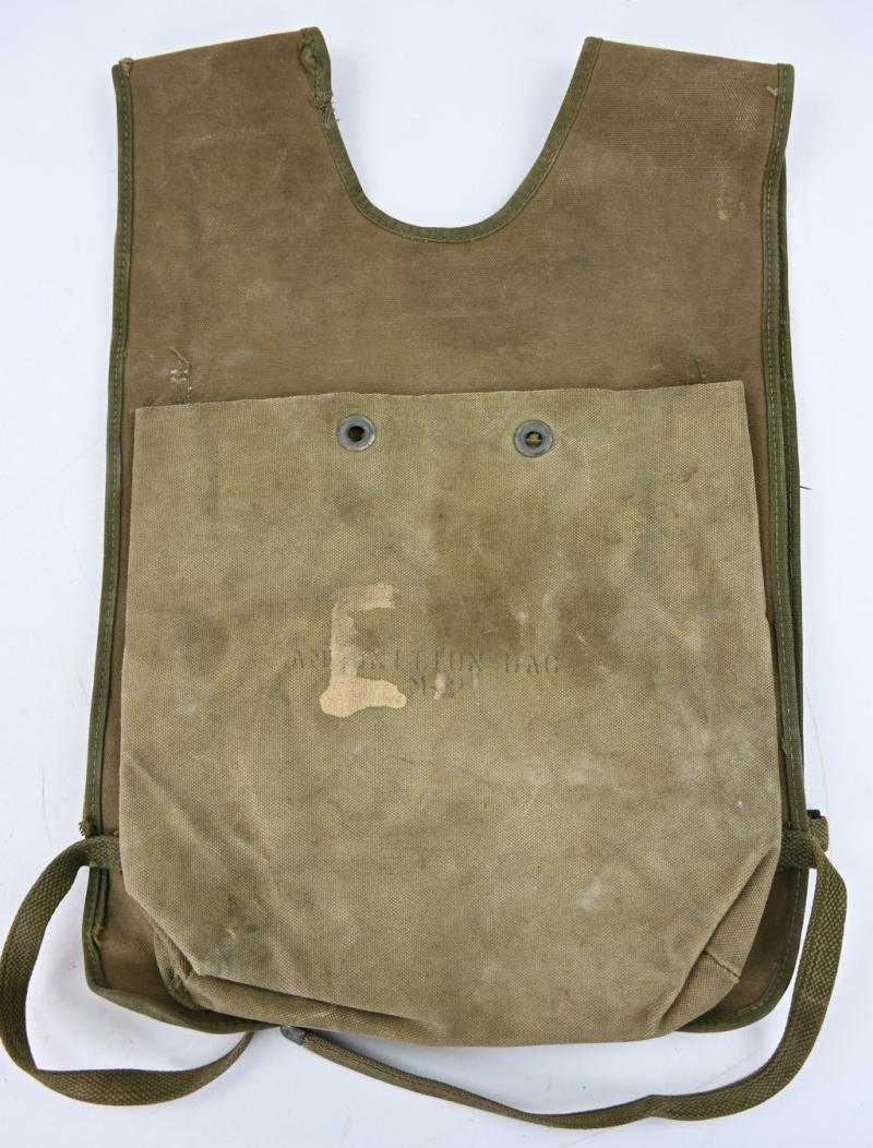 In a very good condition a US M2 Ammunition Vest. The double sided back was to add various ammunition inside like .30 cal M2 cases or Bazooka rounds. A very stunning bag that looks great on every US mannequin!