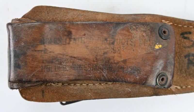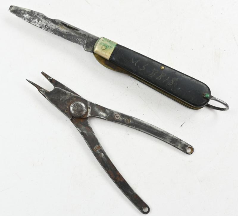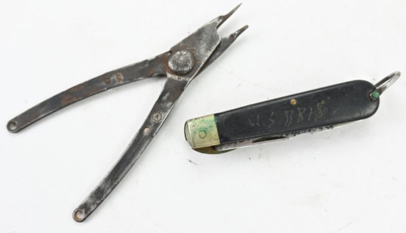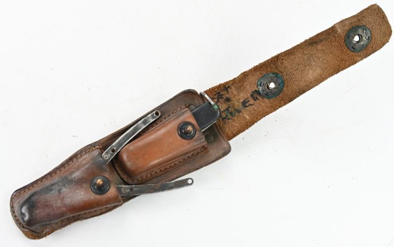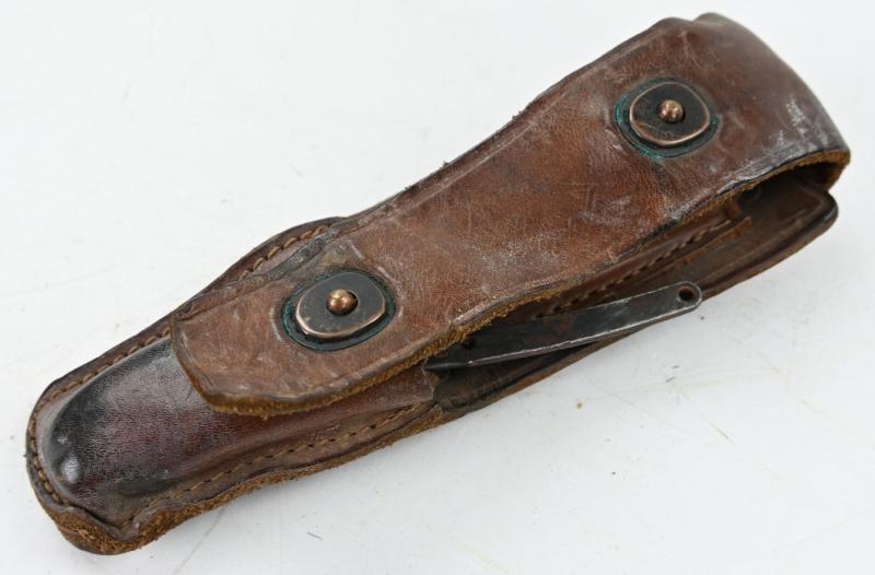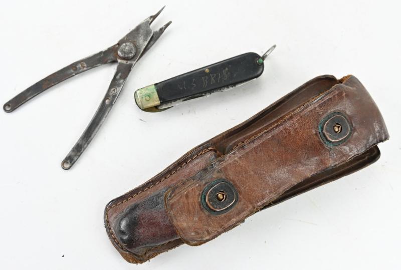The brown leather pouch comes in a good functional condition without damage and has inside the original pliers and pocket knife made by Camillus.