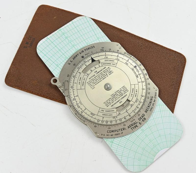 In a mint condition a USAAF WW2 Dead reckoning computer type E-6B in it's original leather case. Nicely dated 1942 example!