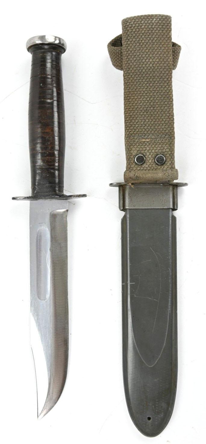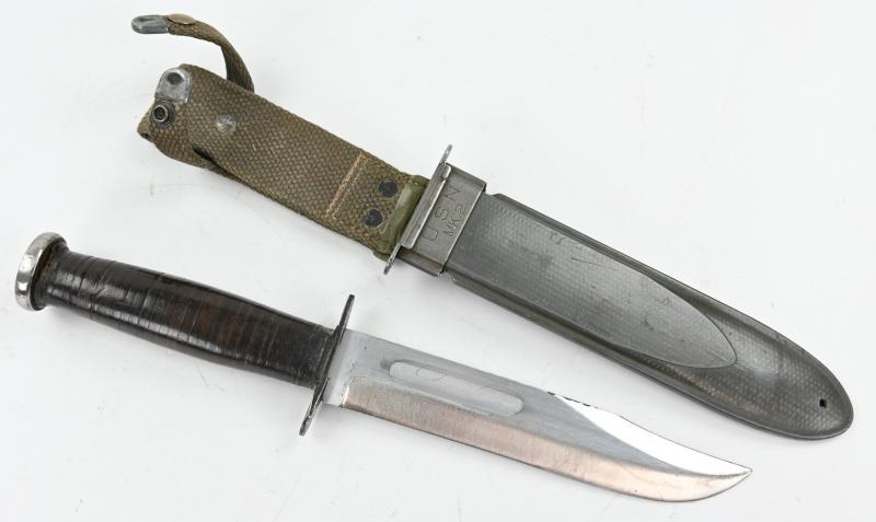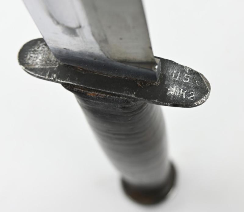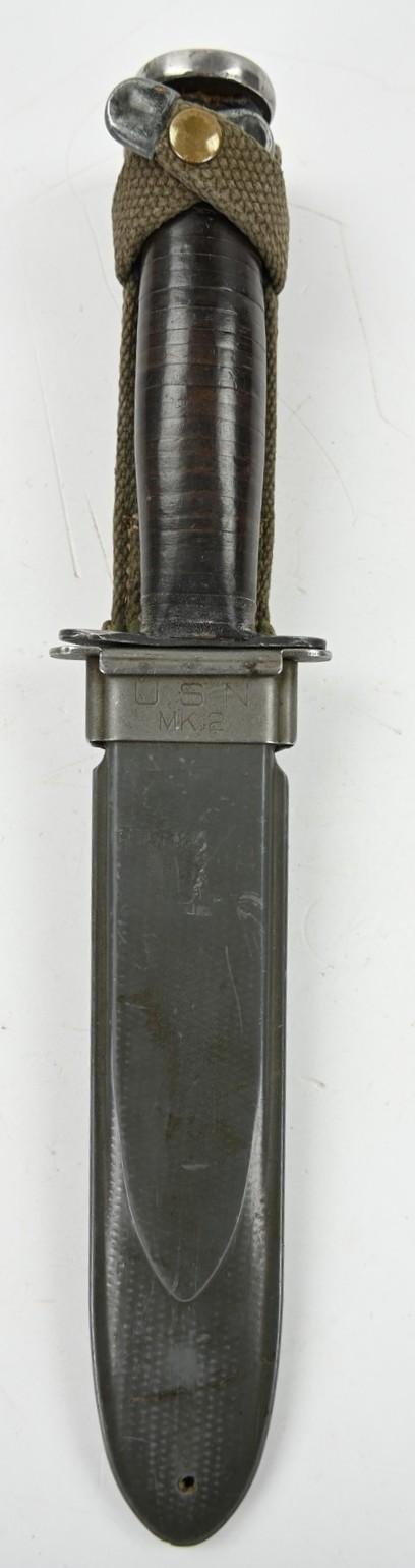 In a very nice condition a US WW2 Navy MK2 Fighting Knife. The Kabar knife is nicely maker marked on the crossguard and is complete with scabbard!