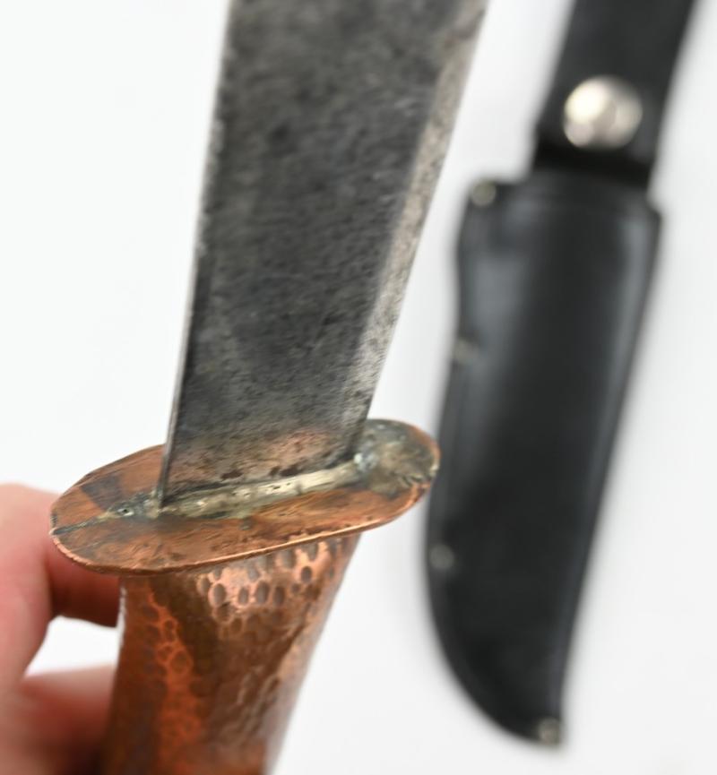 In a very nice condition a stunning US WW2 Private Made Fighting Knife. The knife comes with a bronze made grip and with a supple leather scabbard. A very stunning fighting knife!