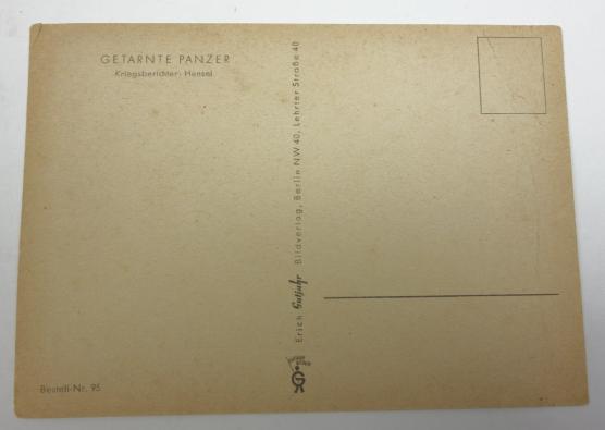 In a nice condition a German Wehrmacht Kriegsberichter Hensel Postcard. The postcard has the drawing of a "Getarnte Panzer" on the front! Very nice postcard!