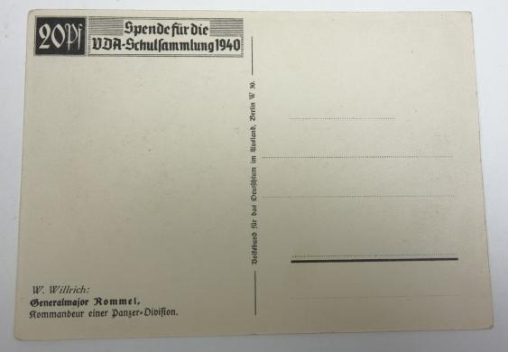 In a nice condition a German 'Willrich' period picture-postcard with a very nice drawing of General Major Rommel, Kommandeur einer Panzer-Division, in overall very nice condition.