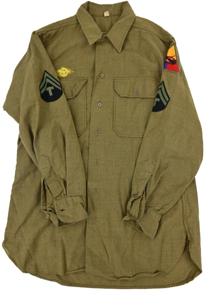 The shirt has the armored division patch originally sewed to the shirt, justlike the rank insignia of a technical sergeant.