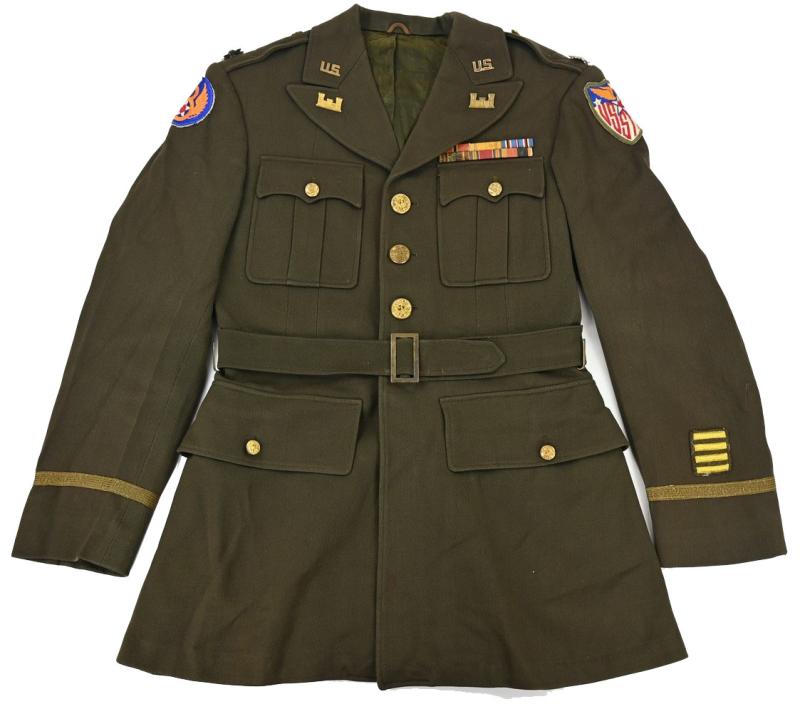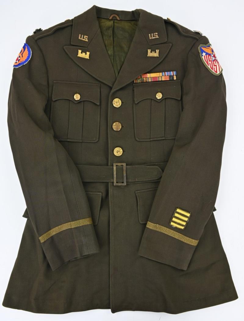 The officer was overseas for 1 year (2 stripes) and comes with the medal ribbonbar of the former owner included the Combat Infantry Badge.