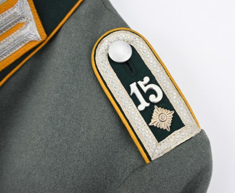 The NCO ranked dress comes in a very good mannequin size. It has the gold yellow branchcolour of the Cavalry troops and contains the shoulderboards of a member of the 'Cavlary Regiment 15'