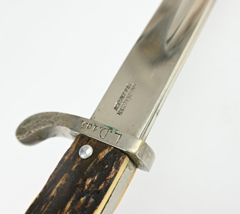 The bayonet comes with the unit maker marking on the crossguard 'L.D. 103' and is maker marked on the blade by E. & F. Hörster from Solingen.