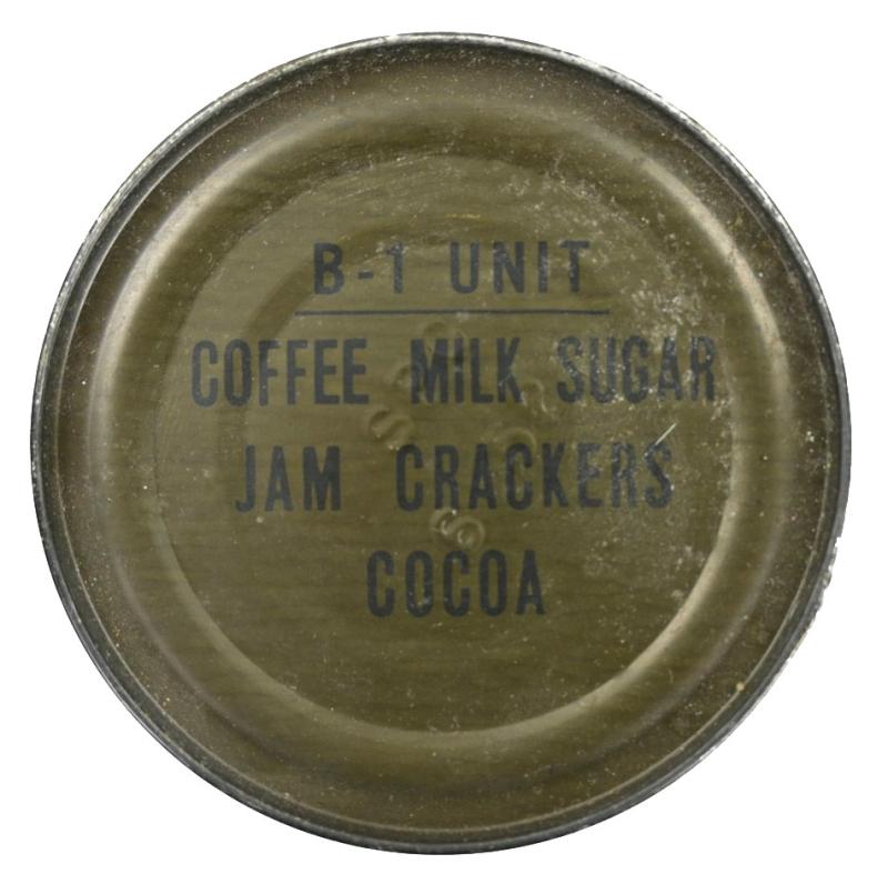 In a very good condition a full tin can of B1 Unit Ration. The ration contains Coffee, Sugar, Milk, Jam, Crackers and Cacao. A very nice post WW2 (Korean War) tin can of ration