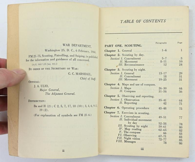 In a very good condition a US WW2 Field Manual FM21-75 Scouting, Patrolling and Sniping The manual is dated 6 February 1944. A very stunning field manual!