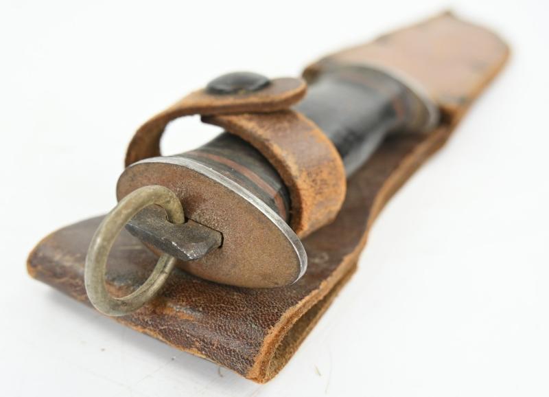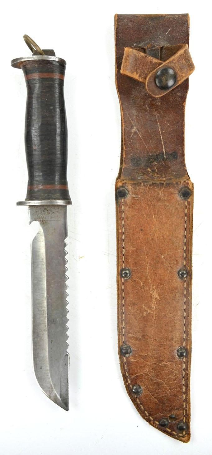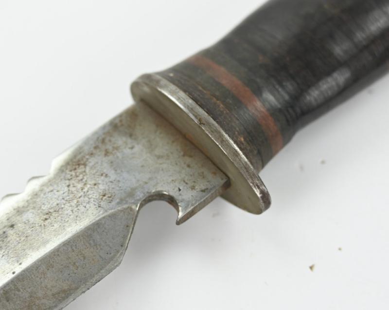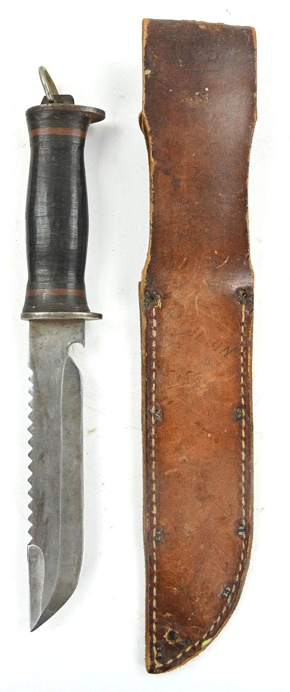 These knives were very popular among USGIs during WWII due to their versatility. While not official U.S. issue, private purchase knives were extremely common. Multiple variations were made with both wood and leather handles (see page 165 of U.S. Military Knives Collector's Guide By Silvey & Boyd). This example has a stacked leather handle, similar to many other military knives of the period. Overall length of the knife is 11 inches, with a 6 1/2 inch "bowie" blade, which has both a sawback and a bottle opener, making it a true survival tool.
