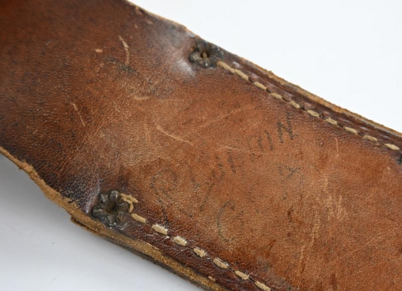 This knife comes with its original scabbard, which has the name of the owner written on the reverse side.