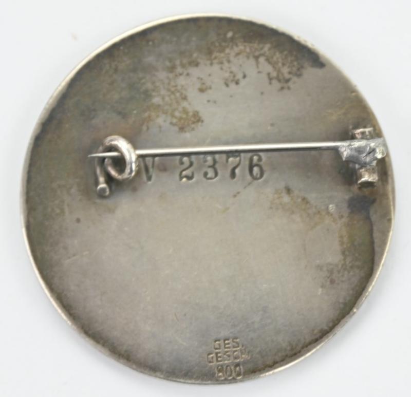 The Brooch is a member badge for volunteer nurse, for the NS Schwesternschaft (NS Sisterhood) in 800 silver. High quality silver with GES GESCH and 800 (for silver content) to reverse and numbered V 2376. 30mm in diameter.