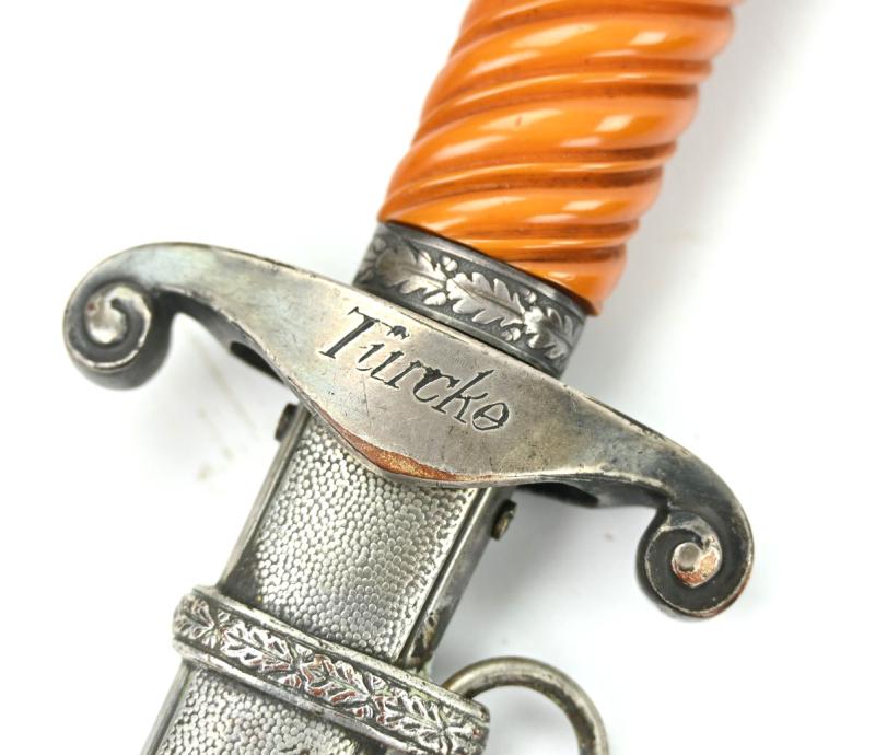 The lower crossguard comes with the name of the former officer ingraved in the crossguard 'Turcke'.
