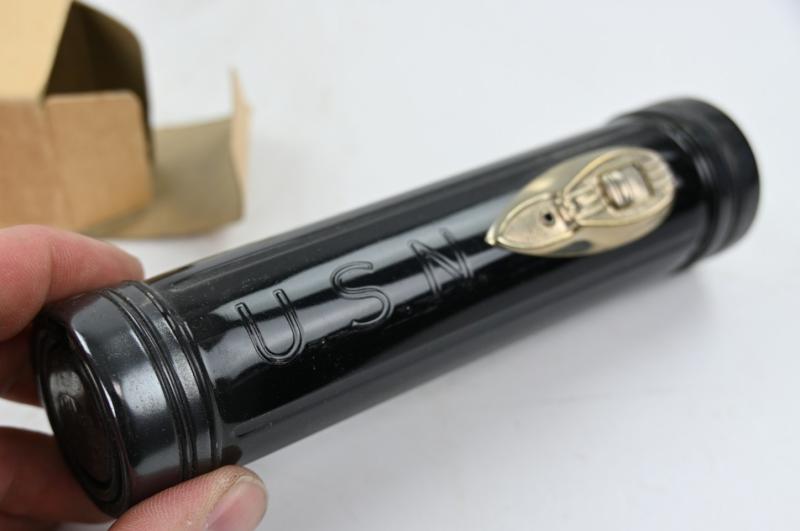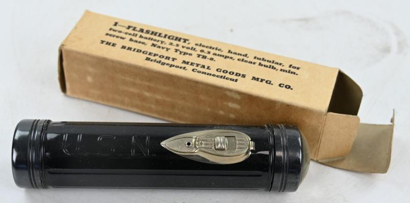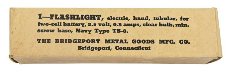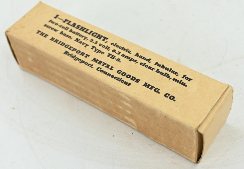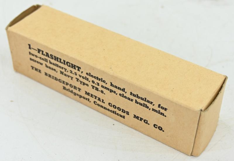 In a very good condition and never used a US Navy WW2 Flashlight TB-8 in the original package. Made by the Bridgefort Metal Goods Mfg. Co. A very stunning early wartime version!