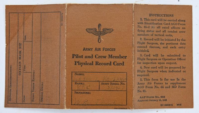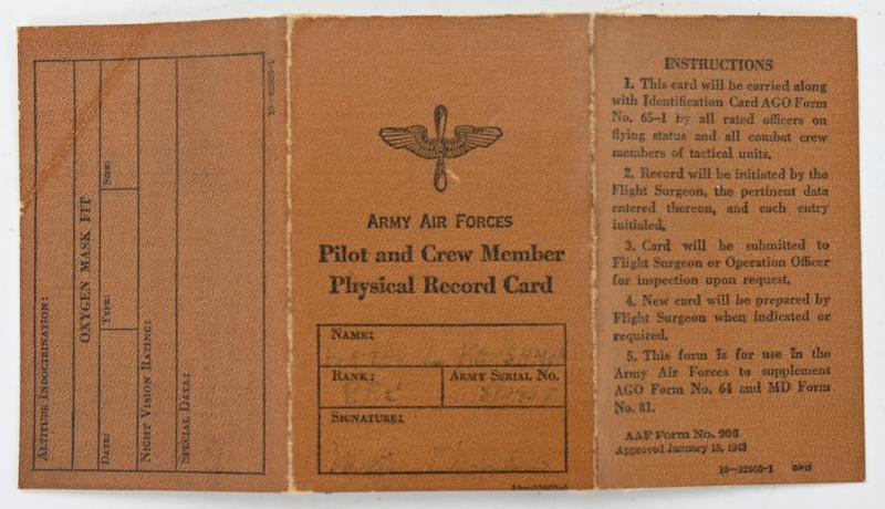 In a very good condition a US Army Air Force WW2 Pilot & Crew Physical Record Card. The card is nicely named and used during WW2.